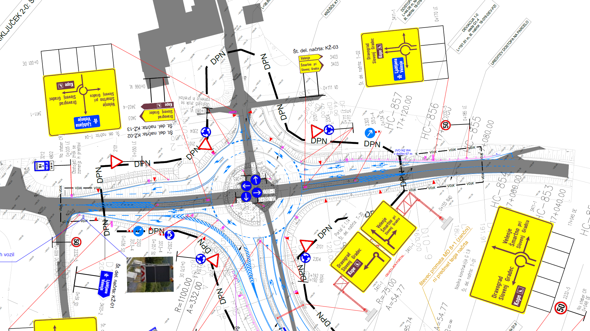 Izdelava načrtov za ureditev križišč in priključkov na državne ali občinske ceste, semaforizacija križišč, eno in večpasovna krožna križišča ter turbo krožna križišča.